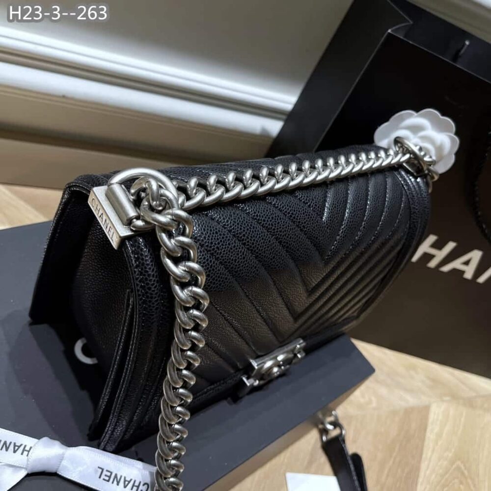 Chanel Boy Caviar Chevron Quilted Flap Bag Black 25Cm