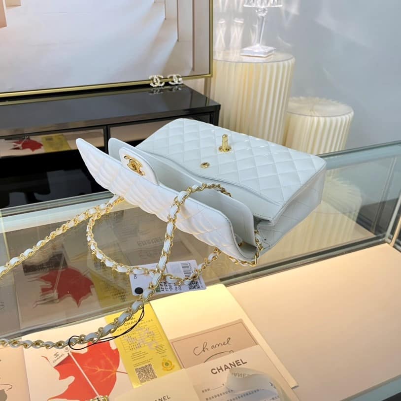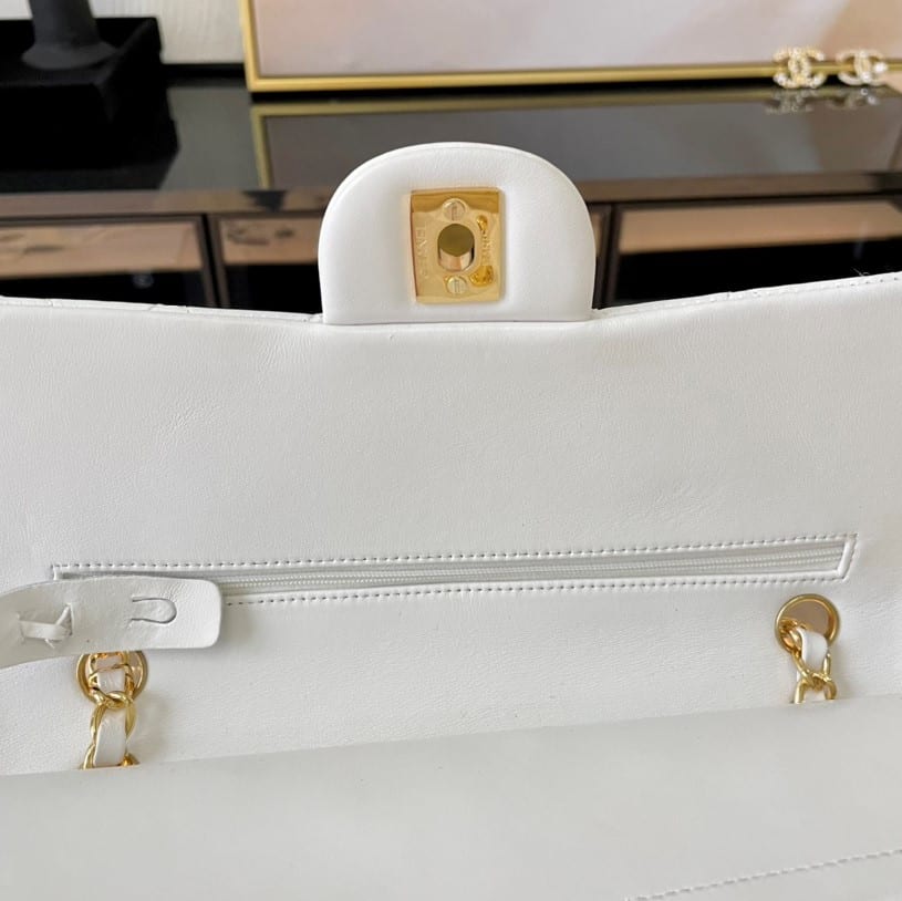 The Chanel Classic Medium Handbag in white radiates pure elegance, with timeless quilting and graceful lines that capture the essence of sophistication. A symbol of prestige and allure, it affirms your style with effortless refinement and iconic charm.