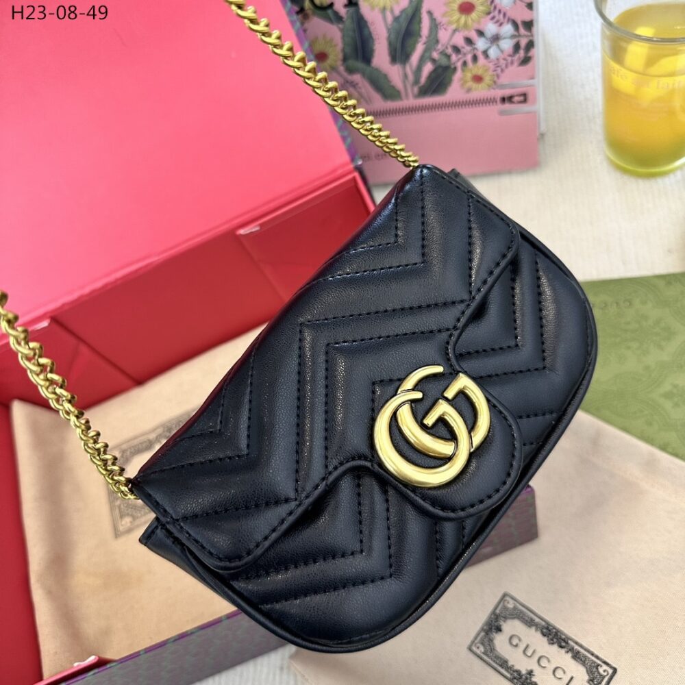 This is the Gucci GG Marmont Matelassé Mini Bag with Chain in Black. Its sleek chevron design, iconic gold Double G, and refined chain strap create a statement of timeless elegance and modern sophistication.