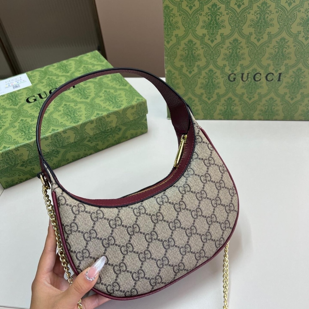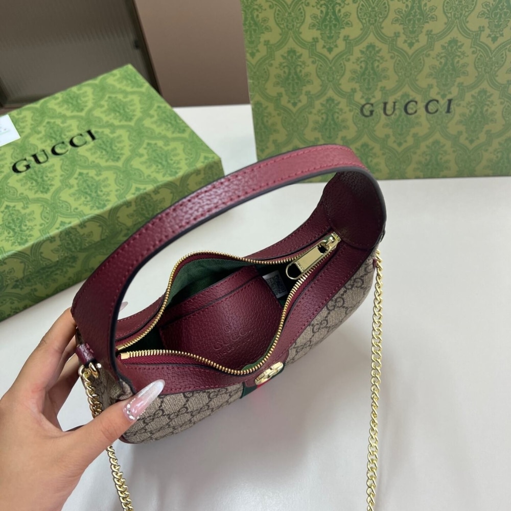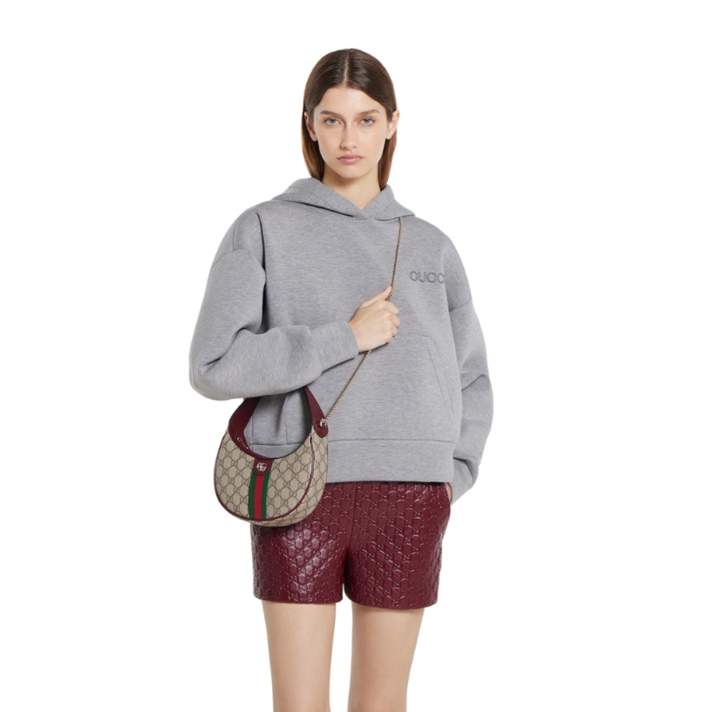 The Ophidia collection evokes the House’s heritage with the signature Web stripe and Double G emblem in light gold-toned finish. The styles are crafted from soft GG Monogram coated fabric, featuring green cotton lining inside. This crescent shape features a delicate chain strap.