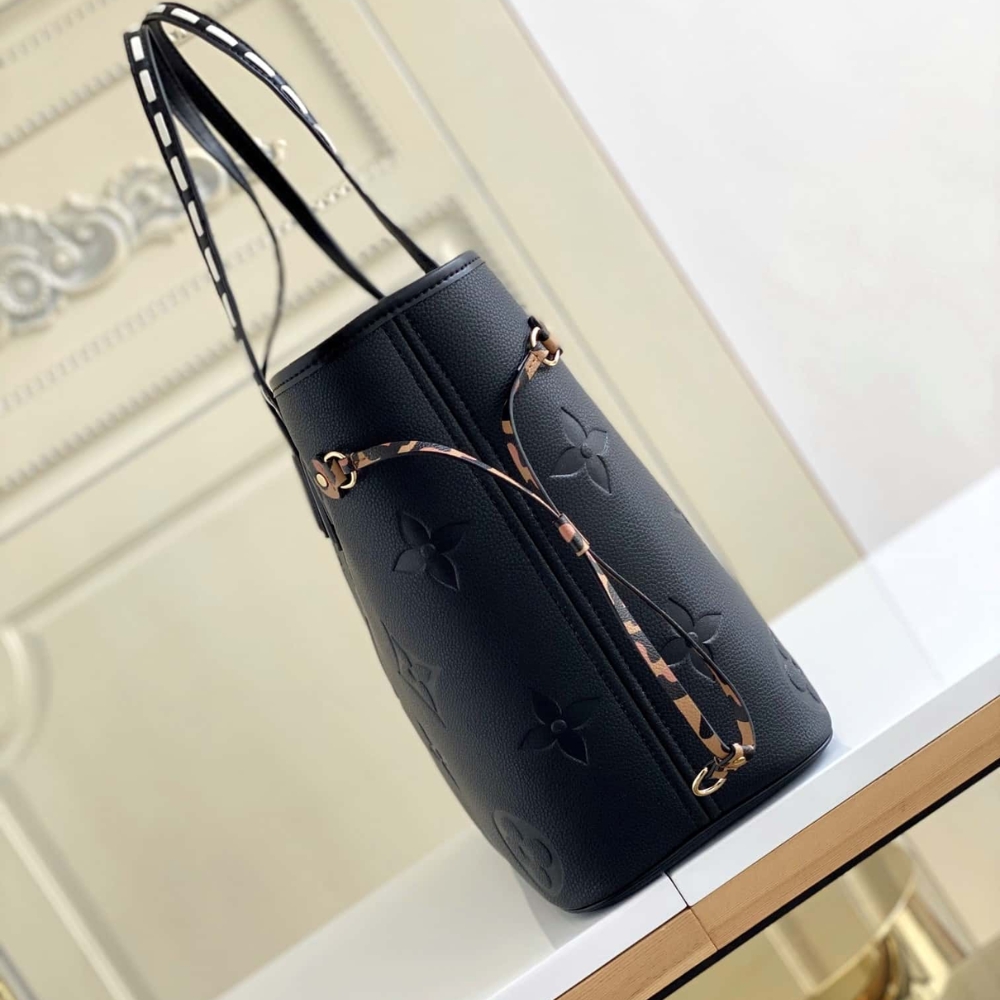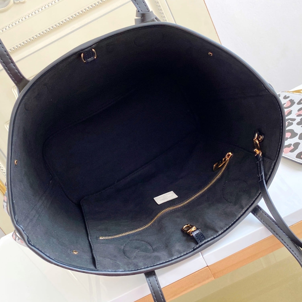 Part of the Louis Vuitton Fall 2021 “Wild at Heart” collection. This limited edition tote bag is crafted of oversized Louis Vuitton monogram embossed calf leather in black. The bag features leather top handles and polished gold-tone hardware with four leopard print side laces for cinching. The top is open to a spacious black microfiber interior with a hanging zipper pocket.