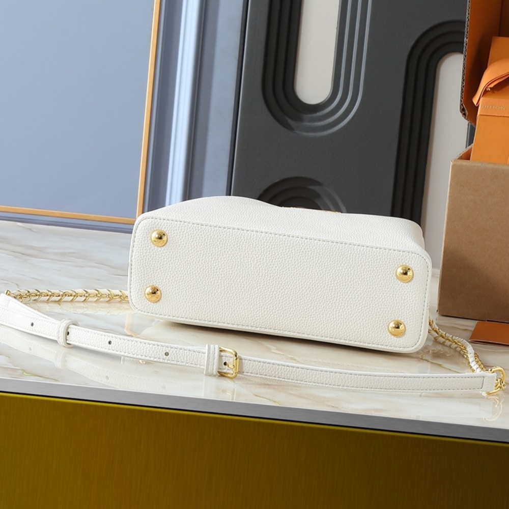 Fashioned from full-grain leather, the now-classic Capucines BB handbag displays a host of House signatures: leather-wrapped LV Initials, jewel-like handle mounts inspired by historic trunks, and a distinctive flap with a Monogram Flower motif. Timelessly elegant, this charming model can be carried by hand or worn cross-body on its detachable strap. First launched in 2013, the Capucines is named for the Parisian street where Louis Vuitton first opened shop, in 1854.
