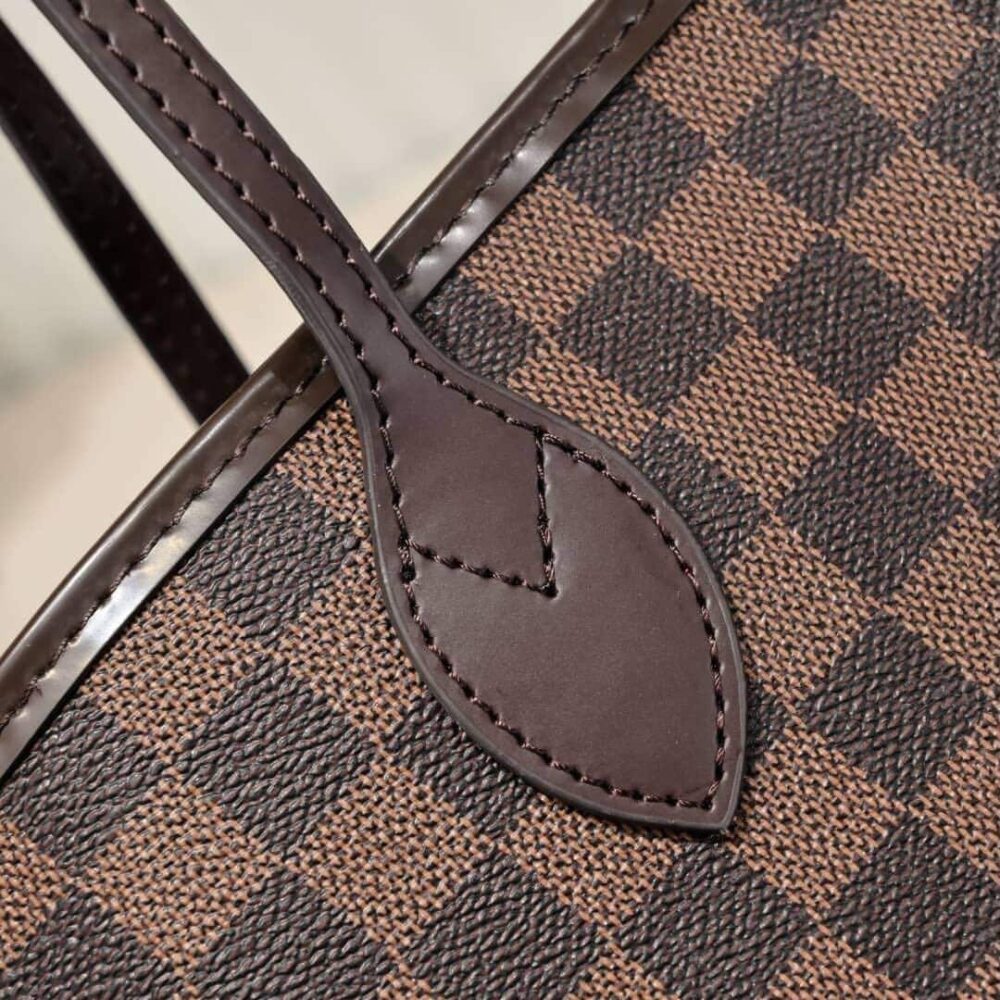 The Neverfull MM tote unites timeless design with heritage details. Elegant in Damier Ebene canvas with natural trim, it is roomy but not bulky, with side laces that cinch for a sleek allure or loosen for a casual look. Slim, comfortable handles slip easily over the shoulder or arm. Lined in colorful textile, it features a removable pouch which can be used as a clutch or an extra pocket.