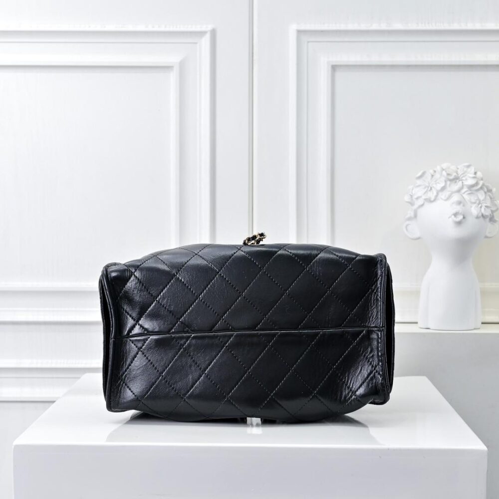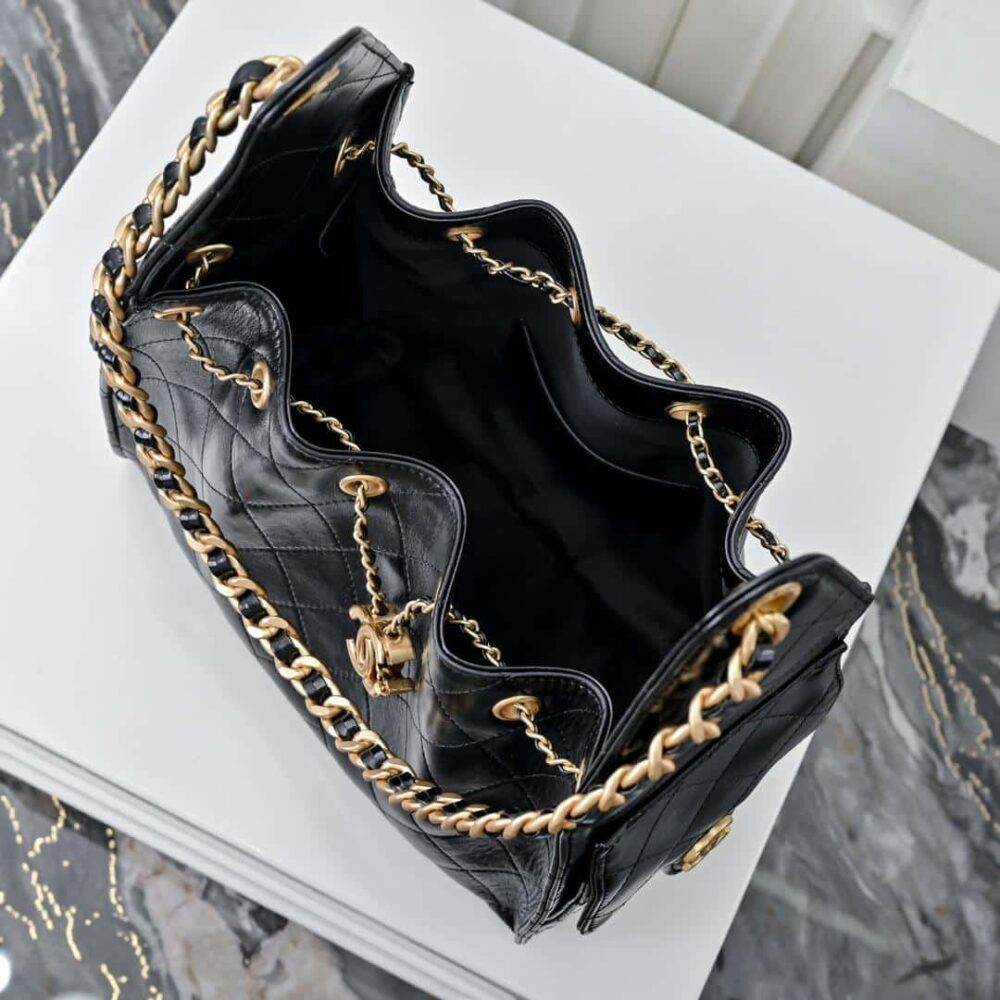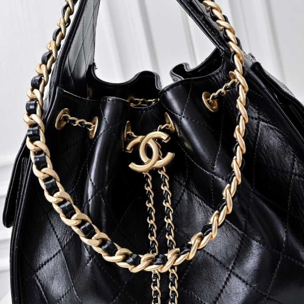 The bag features Chanel’s classic diamond quilting, accented with a chic drawstring closure adorned with the interlocking CC logo. The leather-threaded gold chain strap enhances its luxurious appeal, making it versatile to carry by hand or on the shoulder. Elegant yet practical, it’s a modern twist on Chanel’s timeless style.