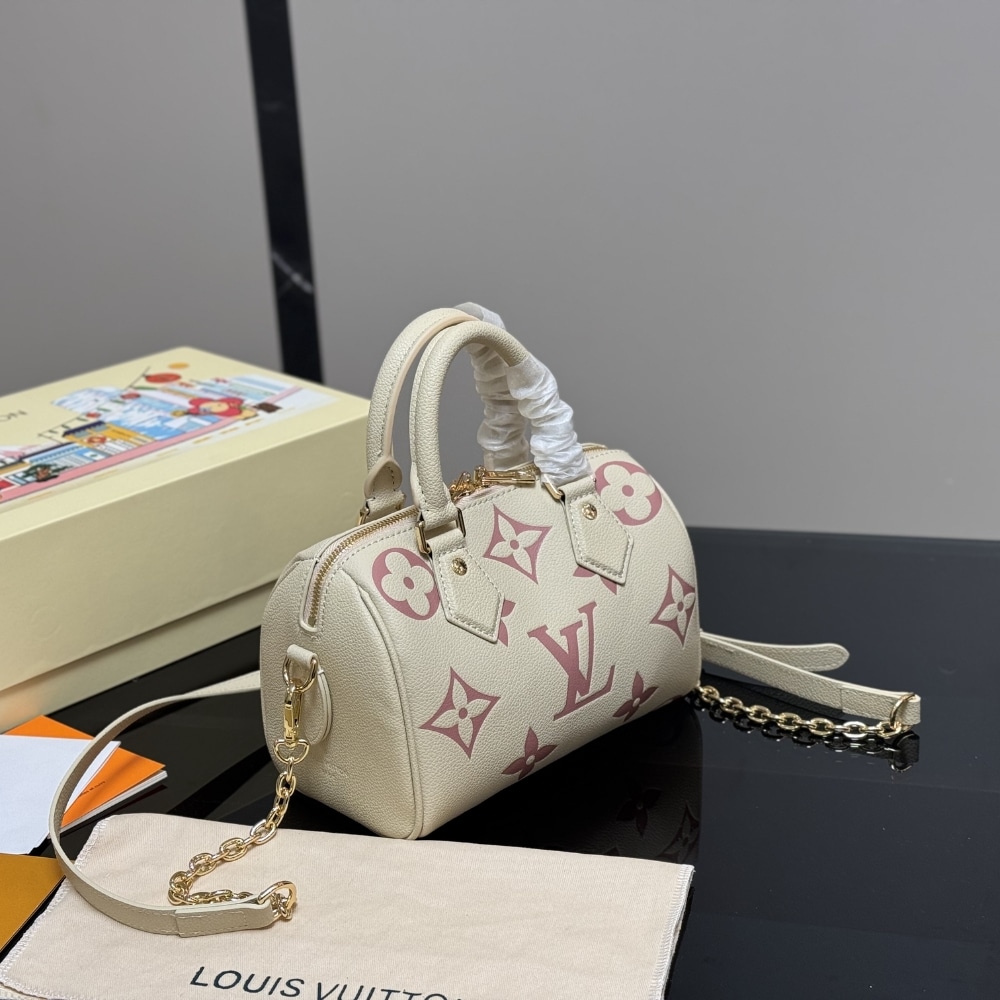 The Speedy Bandoulière 20 bag gets a new look in classic Damier Ebene Canvas. Chocolate brown leather trim and a beige woven strap create a youthful and bright look, suitable for a dynamic style. With its signature shape, gold-tone lock engraved with the LV logo and double rolled leather handles, the design will be an impressive highlight for any outfit.