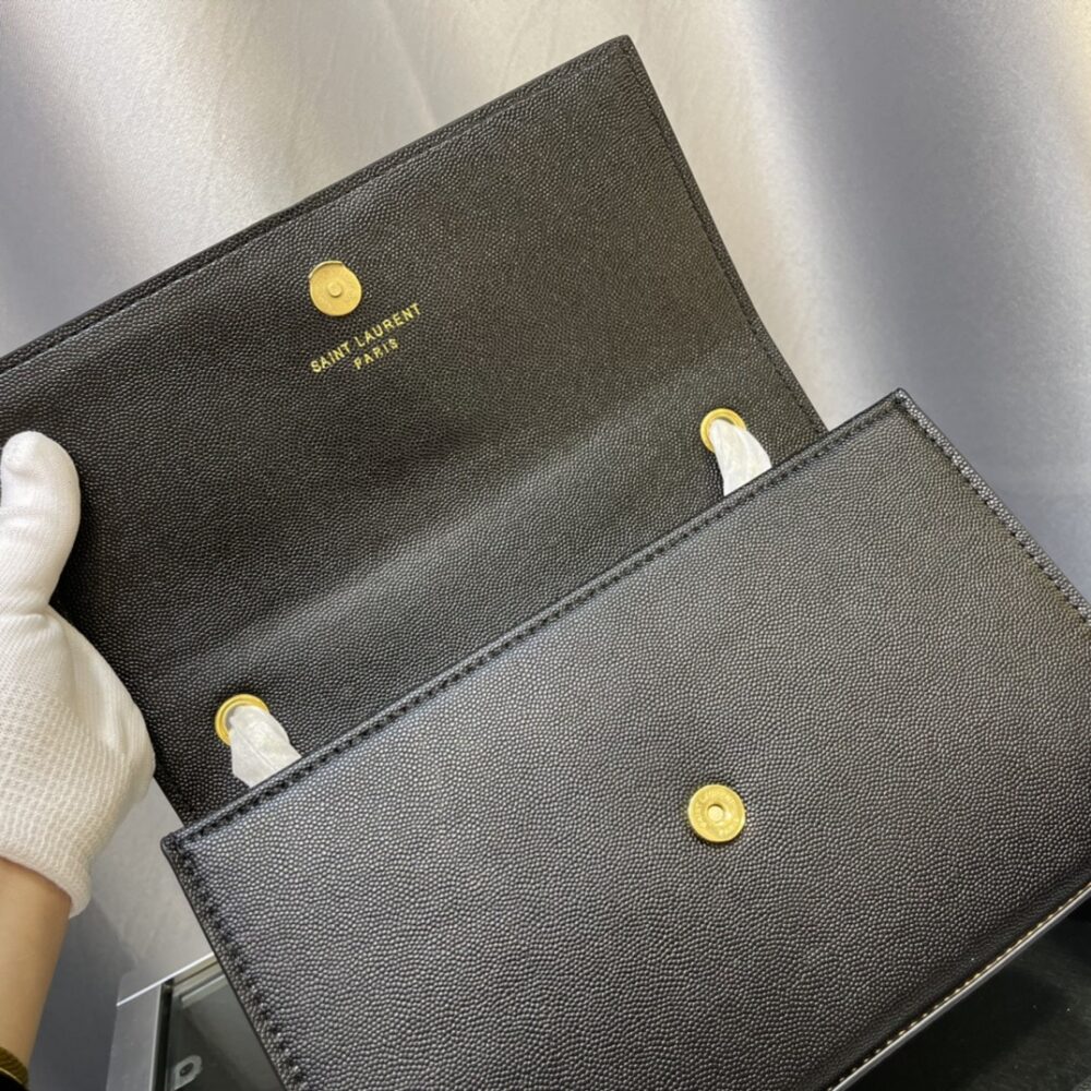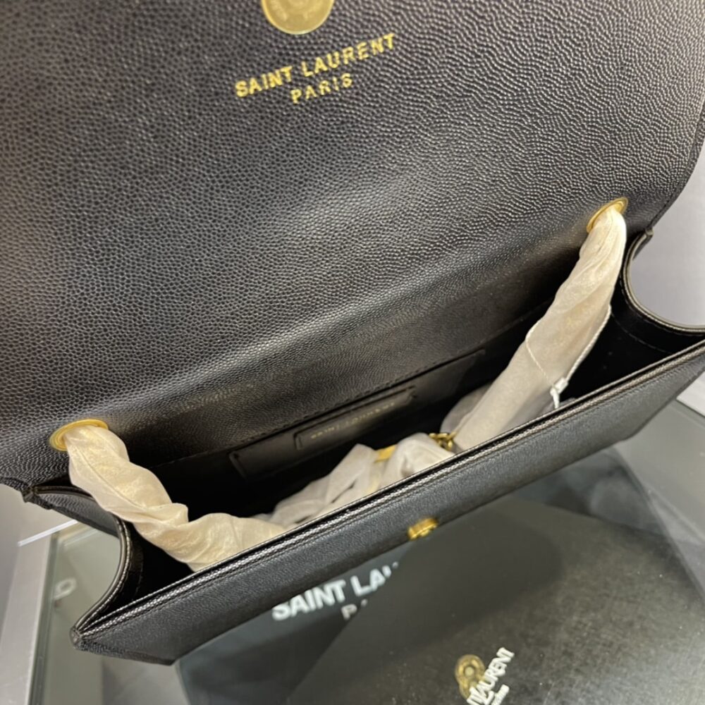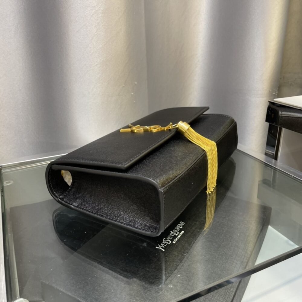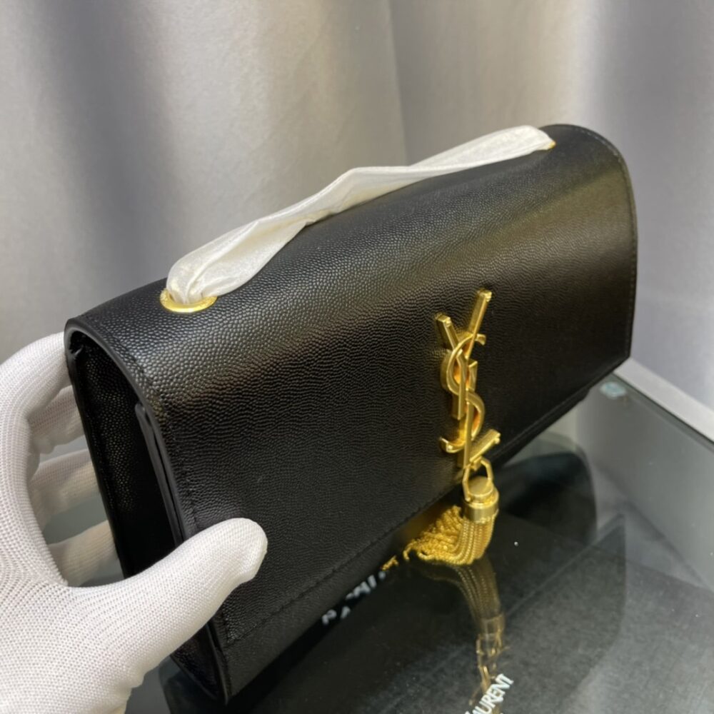 Crafted in black leather, this elegant bag features the iconic YSL monogram in gold with a cascading tassel detail. The structured silhouette and gold chain strap make it perfect for both evening and formal occasions.