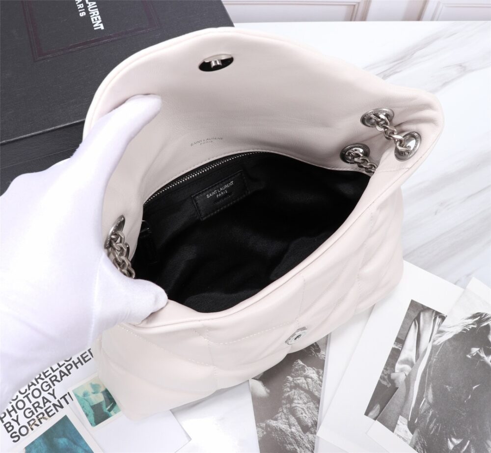 Unavoidable model Saint Laurent Puffer shoulder bag in off-white chevron quilted leather, hardware in silver metal, one chain strap in silver metal allowing the bag to be worn in the hand or on the shoulder.