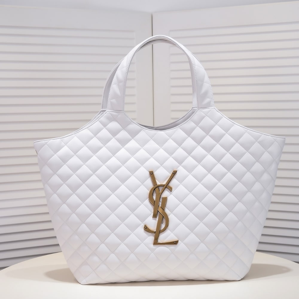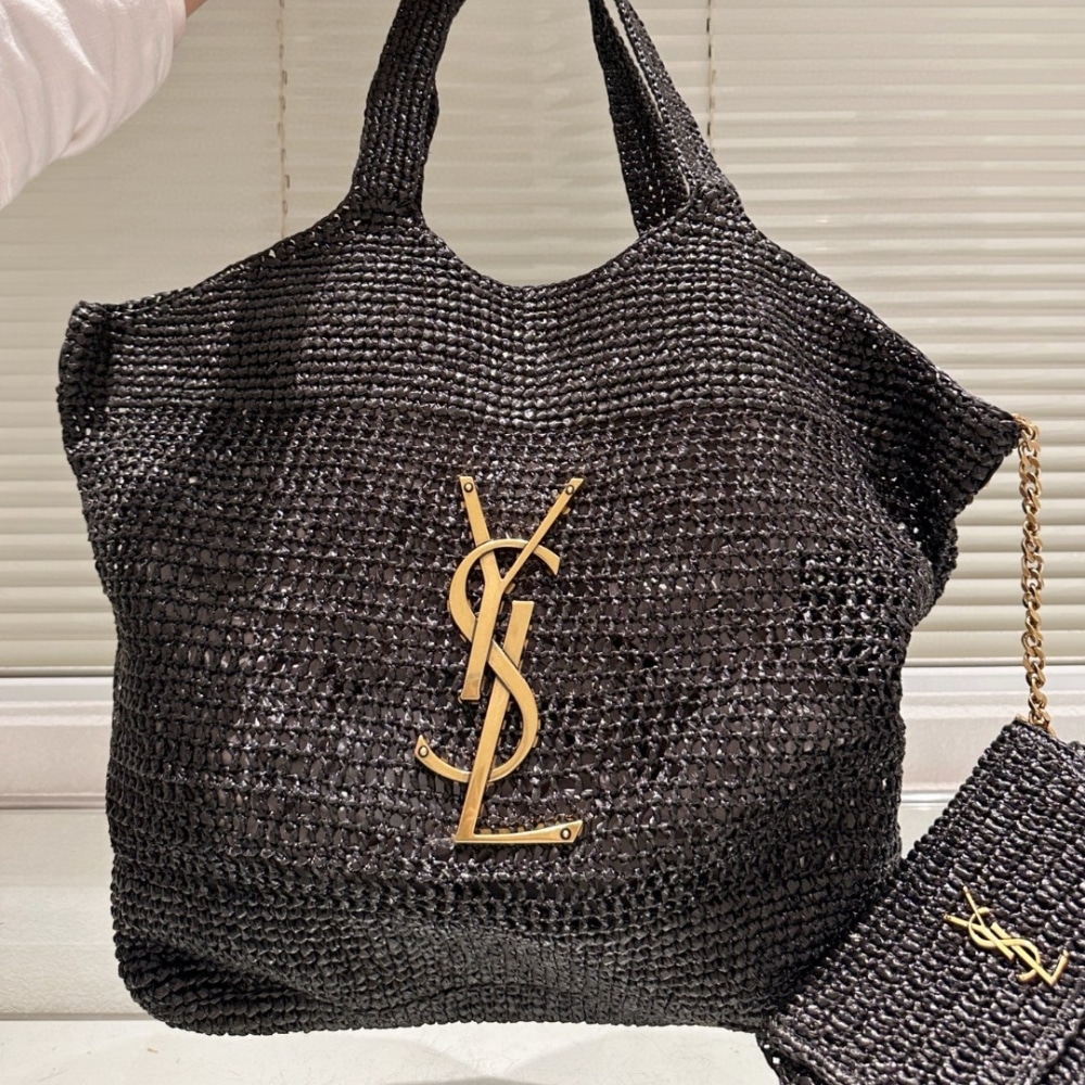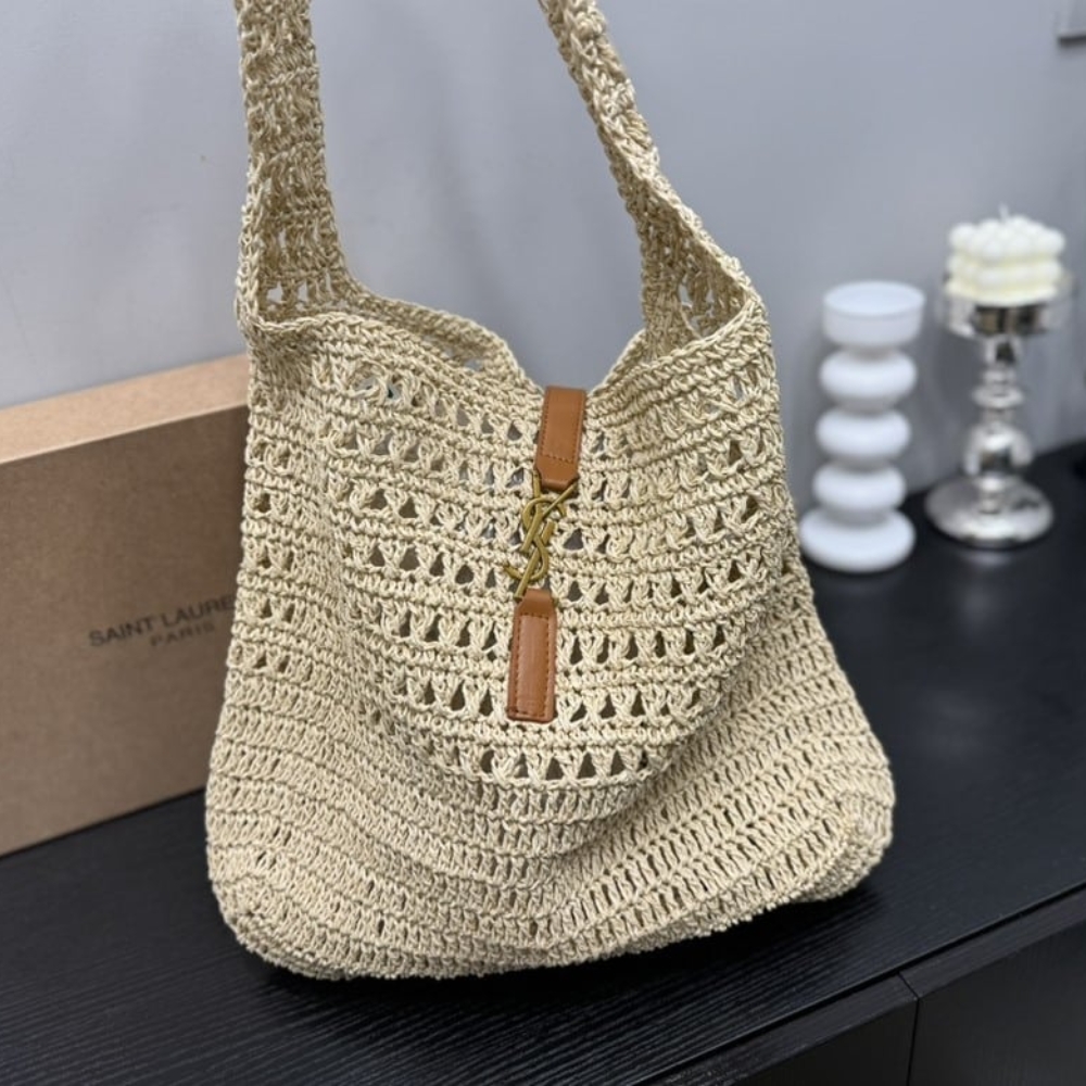 The Saint Laurent Panier Raffia Natural Brown is a chic oversized tote crafted from raffia. Detailed with the iconic YSL charm and leather handles, it exudes effortless summer elegance. Perfect for beach days or city strolls, this spacious bag blends practicality with timeless Saint Laurent style.